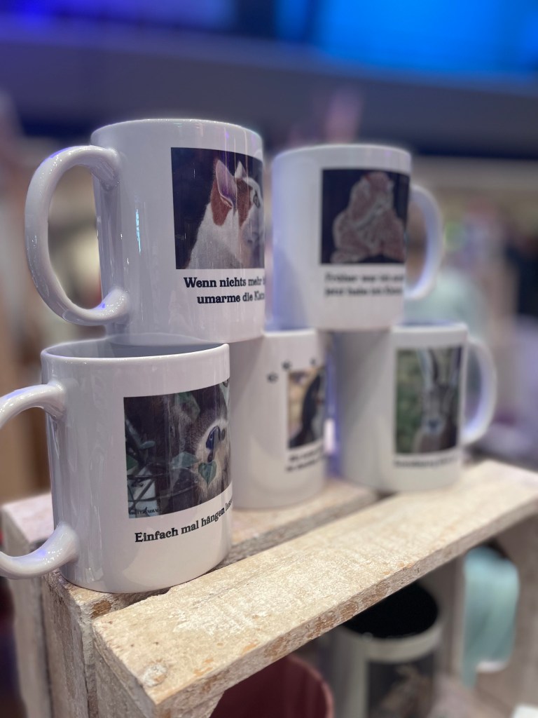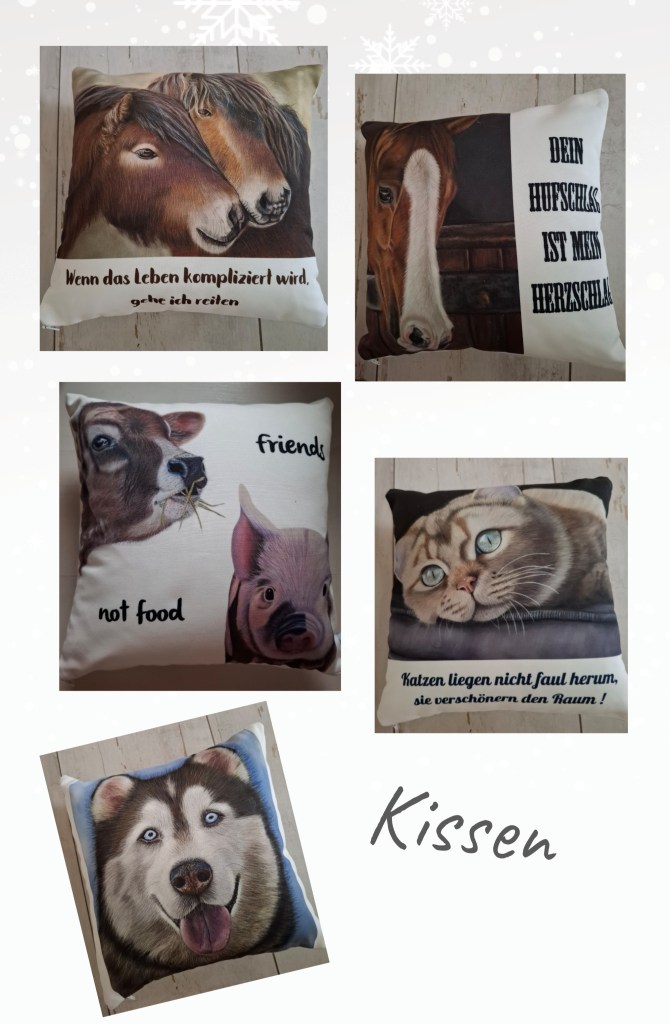 Meine beliebtesten Tiermotive habe ich auf Becher und Kissen drucken lassen. Diese eignen sich hervorragend als Geschenk für Tierfreunde